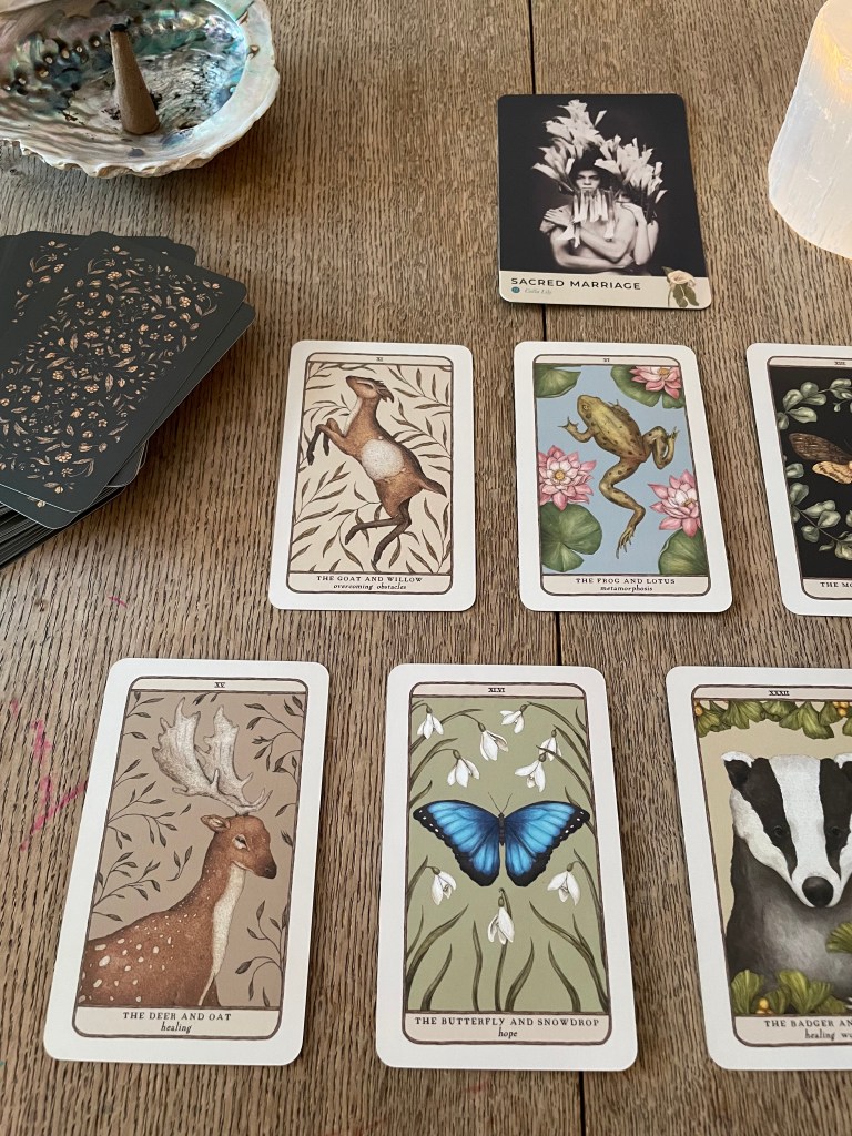 Jeg valgte å lese med orakelkort som er dyrekort og plantekort denne måneden, da jeg synes de minner om våren på hver sin måte. Kortene jeg brukte er Sacret Nature Oracle av Holly Wilmeth og Woodland Wardens av Jessica Roux.